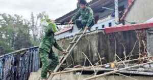 Bộ đội giúp dân chèn, chống nhà cửa, ứng phó bão số 13 Kalmaegi