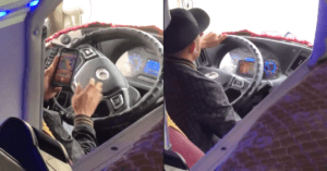 Hình ảnh tài xế xe khách vừa lái xe vừa chơi game – Ảnh: Cắt...